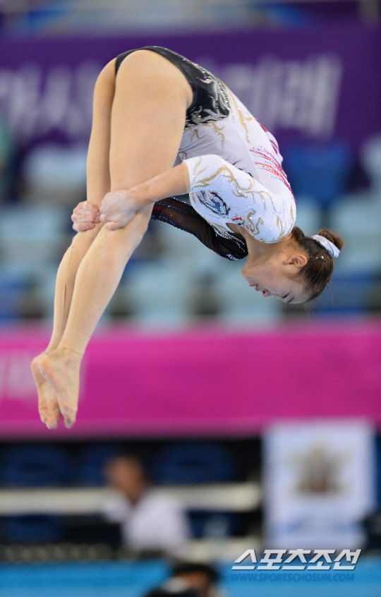 한국여자체조 대표 윤나래가 22일 인천남동체육관에서 열린 2014인천아시안게임 여자기계체조 단체 결승전 마루종목에서 공중회전을 선보이고 있다.