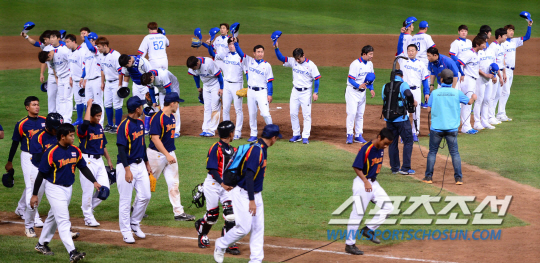 21일 오후 인천 문학구장에서 2014 인천 아시안게임 야구 한국과 태국의 경기가 열렸다. 15대0으로 5회 콜드게임승을 거둔 한국 대표팀 선수들이 마운드 위에서 관중들에게 인사를 하고 있다.