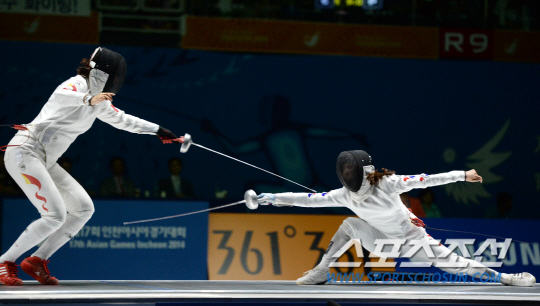 인천 아시안게임 펜싱 여자 에뻬 개인전 결승전 경기가 22일 경기도 고양실내체육관에서 열렸다. 신아람(오른쪽)이 중국 쑨 위지에와 힘겨운 대결을 펼치고 있다.