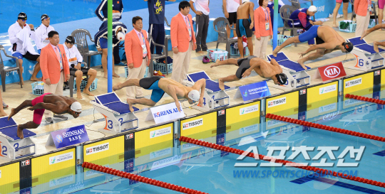 한국수영대표팀 남기웅이 22일 인천문학박태환 수영장에서 열린2014인천아시안게임 자유형 800m계영 결승에서 첫번째 주자로 입수하고 있다. 자유형 800m 계영에는 박태환을 비롯해 남기웅, 정정수, 양준혁이 출전했다.
