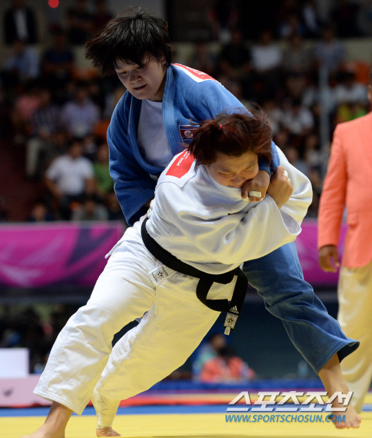 한국 여자 유도의 간판 정경미가 '라이벌' 북한의 설경과 금메달을 놓고 남북 대결을 펼쳤다. 2014 인천아시안게임 여자 유도 -78Kg 결승전 한국의 정경미와 북한의 설경의 경기가 22일 인천 도원체육관에서 열렸다.