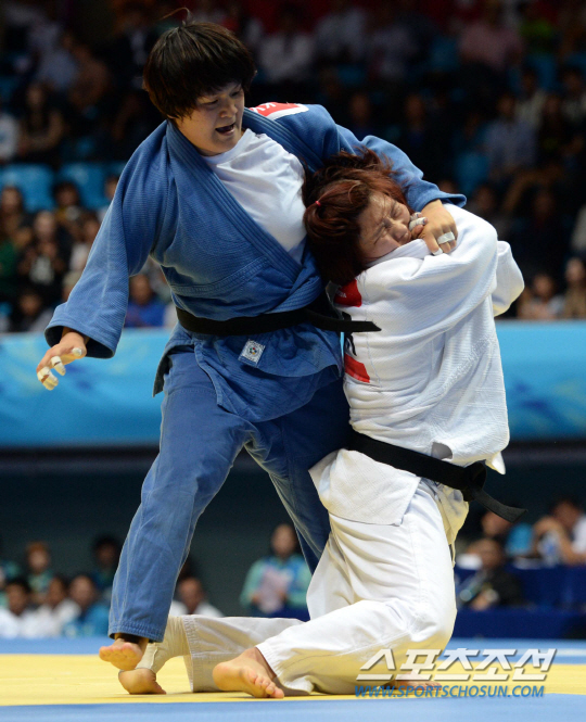 한국 여자 유도의 간판 정경미가 '라이벌' 북한의 설경과 금메달을 놓고 남북 대결을 펼쳤다. 2014 인천아시안게임 여자 유도 -78Kg 결승전 한국의 정경미와 북한의 설경의 경기가 22일 인천 도원체육관에서 열렸다.
