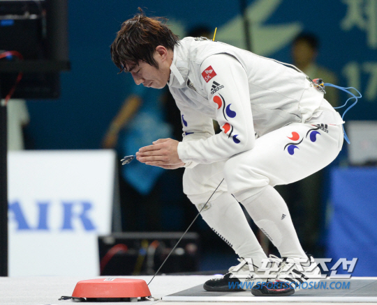 인천 아시안게임 펜싱 남자 플러레 개인전 결승전 경기가 22일 경기도 고양실내체육관에서 열렸다. 한국 허준이 중국 마젠페와 접전을 벌였지만 13-15로 패한 후 아쉬움을 감추지 못하고 있다.