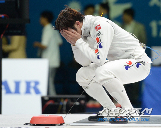 인천 아시안게임 펜싱 남자 플러레 개인전 결승전 경기가 22일 경기도 고양실내체육관에서 열렸다. 한국 허준이 중국 마젠페와 접전을 벌였지만 13-15로 패한 후 아쉬움을 감추지 못하고 있다.