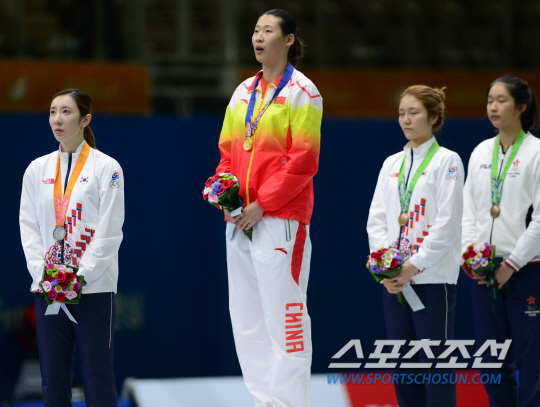 인천 아시안게임 펜싱 여자 에뻬 개인전 결승전 경기가 22일 경기도 고양실내체육관에서 열렸다. 은메달을 목에 건 신아람(왼쪽)이 시상대에서 금메달을 목에 건 쑨위제(중국)와 함께 국기를 바라보고 있다.