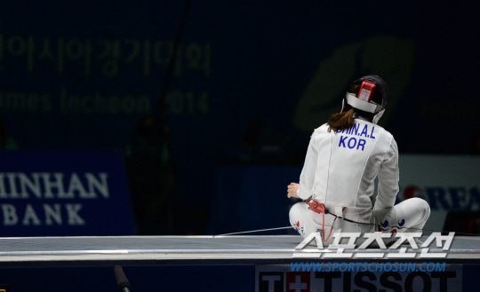 인천 아시안게임 펜싱 여자 에뻬 개인전 결승전 경기가 22일 경기도 고양실내체육관에서 열렸다. 중국 쑨위제에게 패한 신아람이 아쉬움을 감추지 못하고 있다.