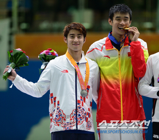 인천 아시안게임 펜싱 남자 플러레 개인전 결승전 경기가 22일 경기도 고양실내체육관에서 열렸다. 중국 마젠페에 아깝게 패하며 은메달을 목에 건 허준이 손을 흔들고 있따.