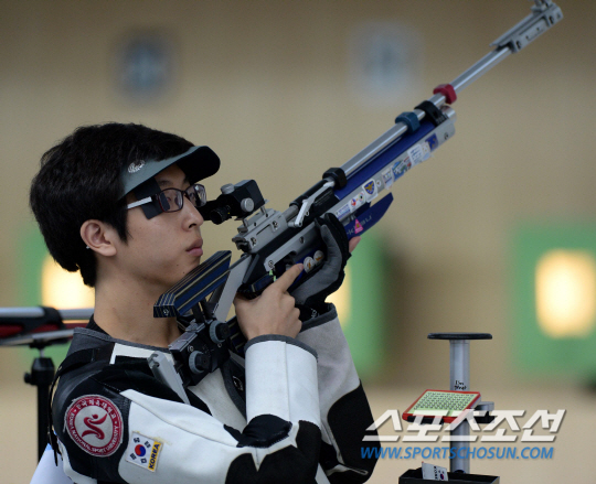 2014 인천아시안게임 사격 남자 10m 공기소총 본선이 23일 인천 옥련국제사격장에서 열렸다. 김현준이 경기를 펼치고 있다. 남자 10m 공기소총에는 한진섭, 김상도, 김현준이 출전했다.