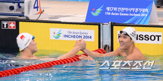 한국수영대표팀 박태환이 23일 인천문학박태환 수영장에서 열린2014인천아시안게임 남자 400m 자유영 예선전을 마치고 중국 쑨양과 손을 맞잡고 있다.