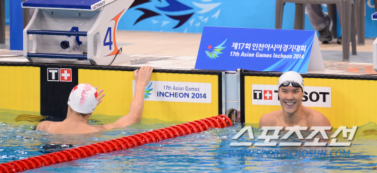 한국수영대표팀 박태환이 23일 인천문학박태환 수영장에서 열린2014인천아시안게임 남자 400m 자유영 예선전을 마치고 밝게 웃고 있다.