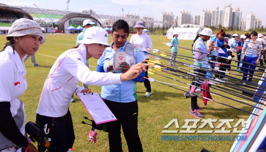 22일 오후 인천 계양사이아드 양궁경기장에서 양궁 리커브 여자 참가자격결정이 열렸다. 한국 이특영이 과녁의 활을 확인하고 있다.