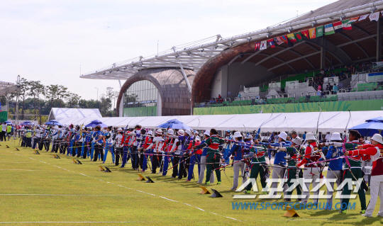 22일 오후 인천 계양사이아드 양궁경기장에서 양궁 리커브 여자 참가자격결정이 열렸다. 각국 선수들이 타겟을 향해 활시위를 당기고 있다.