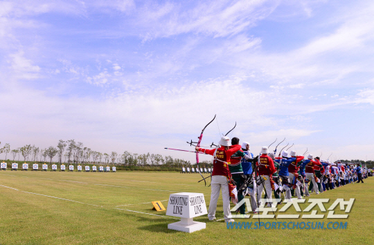 22일 오후 인천 계양사이아드 양궁경기장에서 양궁 리커브 여자 참가자격결정이 열렸다. 각국 선수들이 타겟을 향해 활시위를 당기고 있다.