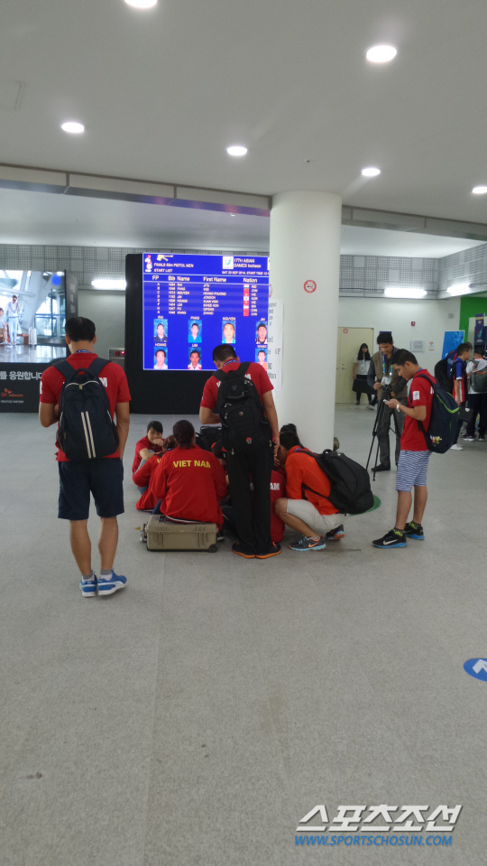낭만적인 장면이라고 생각할 수도 있다. 하지만 이유를 알고나면 씁쓸해진다. 선수들이 쉴만한 공간이 턱없이 부족하기 때문이다. 4층 규모 건물에 선수들이 휴식을 취할 수 있는 공간은 선수임원 간이식당 하나밖에 없다. 테이블 20개 남짓 놓여있다. 100여명 수용 가능하다. 이곳에서 선수들은 조직위가 지급하는 도시락을 먹는다. 의자와 테이블만 있을 뿐 다른 편의시설은 하나도 없다. 선수들은 휴식할 장소를 찾아 계단에 걸터앉거나 2층 로비 바닥에 주저앉을 수 밖에 없다. 흔한 매점도 없다. 선수들이나 관객들이 무엇을 먹으려고 하면 바깥까지 나가야만 한다.