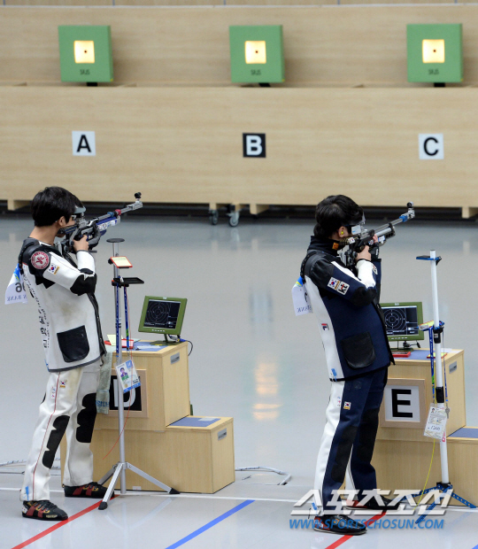 2014 인천아시안게임 사격 남자 10m 공기소총 결선이 23일 인천 옥련국제사격장에서 열렸다. 김현준(왼쪽)과 김상도가 경기를 펼치고 있다. 김상도와 김현준은 각각 6,7위를 기록하며 메달권 진입에는 실패했다.