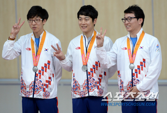 2014 인천아시안게임 사격 남자 10m 공기소총 결선이 23일 인천 옥련국제사격장에서 열렸다. 사격 남자 10m 공기소총에 출전한 김현준, 김상도, 한진섭이 단체전에서 은메달을 획득했다. 밝은 미소로 메달과 함께 포즈를 취한 세 선수의 모습.