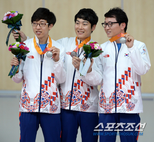2014 인천아시안게임 사격 남자 10m 공기소총 결선이 23일 인천 옥련국제사격장에서 열렸다. 사격 남자 10m 공기소총에 출전한 김현준, 김상도, 한진섭이 단체전에서 은메달을 획득했다. 밝은 미소로 메달과 함께 포즈를 취한 세 선수의 모습. 인천=허상욱 기자 wook@sportschosun.com