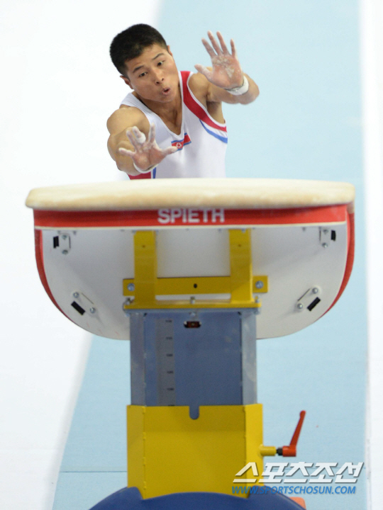 2014 인천아시안게임 기계체조 남자 개인 종합 결승전이 23일 인천 남동체육관에서 열렸다. 북한의 라원철이 도마연기를 하고 있다.