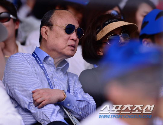 23일 오후 인천 드림파크 승마장에서 2014 인천 아시안게임 승마 마장마술 개인전이 열렸다. 한화 김승연 회장이 아들인 한국 김동선의 경기를 응원하기 위해 승마장을 찾아 관전하고 있다.