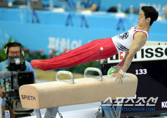 2014 인천아시안게임 기계체조 남자 개인 종합 결승전이 23일 인천 남동체육관에서 열렸다. 한국의 박민수가 안마연기를 하고 있다.