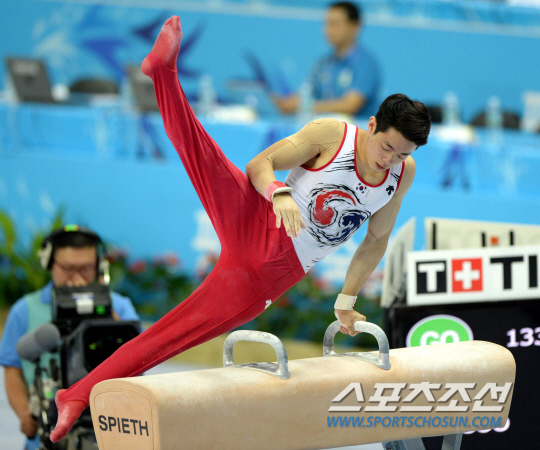 2014 인천아시안게임 기계체조 남자 개인 종합 결승전이 23일 인천 남동체육관에서 열렸다. 한국의 박민수가 안마연기를 하고 있다.