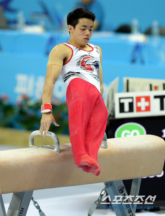 2014 인천아시안게임 기계체조 남자 개인 종합 결승전이 23일 인천 남동체육관에서 열렸다. 한국의 박민수가 안마연기를 하고 있다.