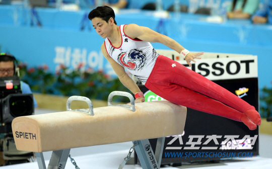 2014 인천아시안게임 기계체조 남자 개인 종합 결승전이 23일 인천 남동체육관에서 열렸다. 한국의 박민수가 안마연기를 하고 있다.