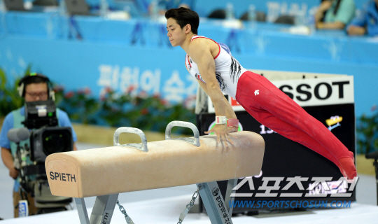 2014 인천아시안게임 기계체조 남자 개인 종합 결승전이 23일 인천 남동체육관에서 열렸다. 한국의 박민수가 안마연기를 하고 있다.