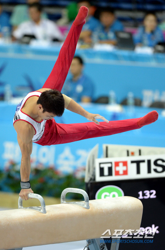 2014 인천아시안게임 기계체조 남자 개인 종합 결승전이 23일 인천 남동체육관에서 열렸다. 한국의 이상욱이 안마연기를 하고 있다.
