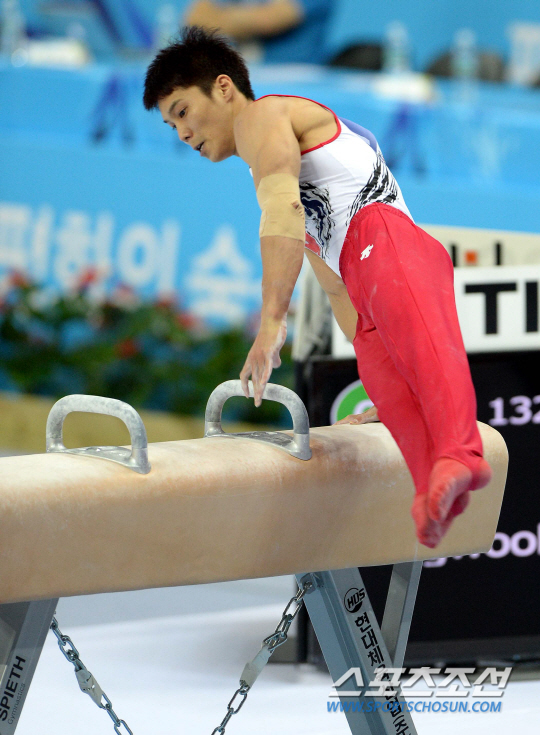 2014 인천아시안게임 기계체조 남자 개인 종합 결승전이 23일 인천 남동체육관에서 열렸다. 한국의 이상욱이 안마연기를 하고 있다.