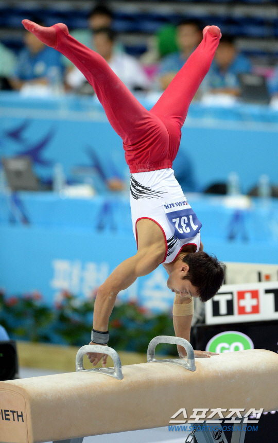 2014 인천아시안게임 기계체조 남자 개인 종합 결승전이 23일 인천 남동체육관에서 열렸다. 한국의 이상욱이 안마연기를 하고 있다.