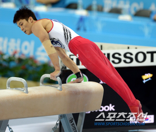 2014 인천아시안게임 기계체조 남자 개인 종합 결승전이 23일 인천 남동체육관에서 열렸다. 한국의 이상욱이 안마연기를 하고 있다.
