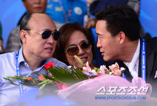 23일 오후 인천 드림파크 승마장에서 2014 인천 아시안게임 승마 마장마술 개인전이 열렸다. 승마장을 찾은 한화 김승연 회장 부부가 은메달을 차지한 아들 김동선과 즐겁게 이야기를 나누고 있다.