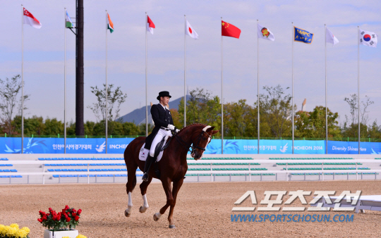 23일 오후 인천 드림파크 승마장에서 2014 인천 아시안게임 승마 마장마술 개인전이 열렸다. 은메달을 차지한 한국 김동선이 연기를 마치고 있다.