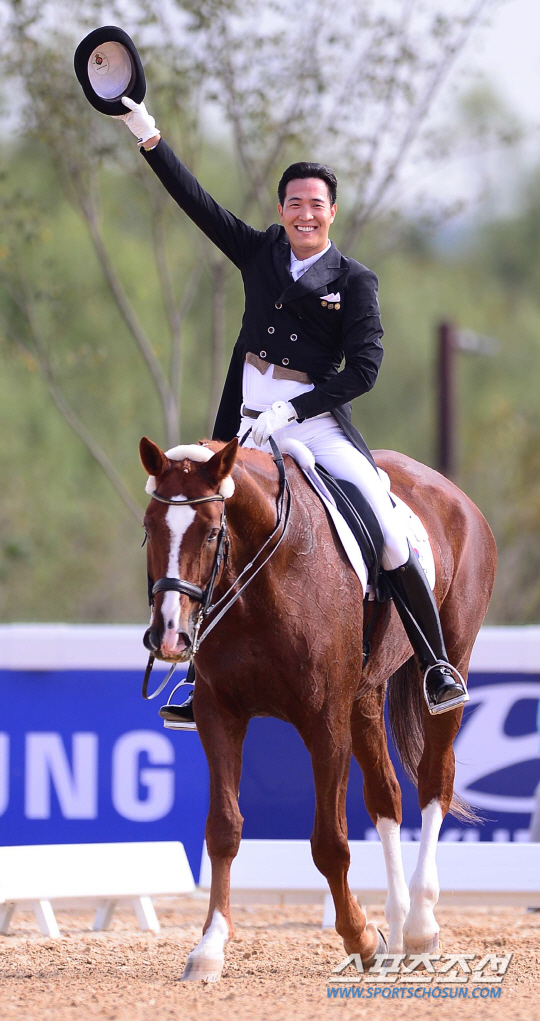 23일 오후 인천 드림파크 승마장에서 2014 인천 아시안게임 승마 마장마술 개인전이 열렸다. 연기를 마친 한국 김동선이 관중들에게 인사하고 있다..