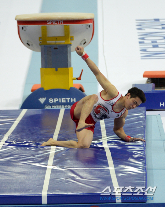 2014 인천아시안게임 기계체조 남자 개인 종합 결승전이 23일 인천 남동체육관에서 열렸다. 한국의 박민수가 도마연기를 하고 있다.