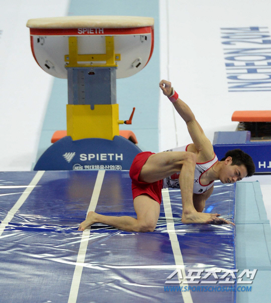 2014 인천아시안게임 기계체조 남자 개인 종합 결승전이 23일 인천 남동체육관에서 열렸다. 한국의 박민수가 도마연기를 하고 있다.
