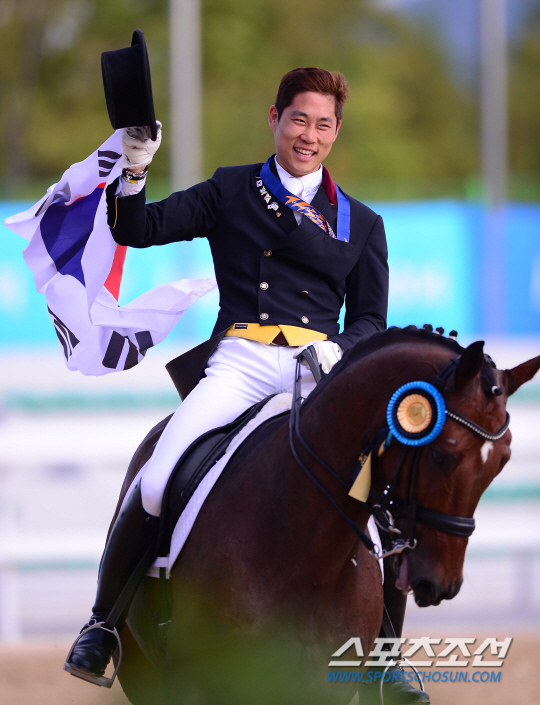 23일 오후 인천 드림파크 승마장에서 2014 인천 아시안게임 승마 마장마술 개인전이 열렸다. 금메달을 차지한 한국 황영식이 태극기를 든 채 경기장을 돌고 있다.