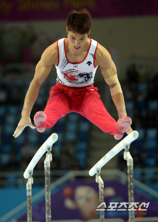 2014 인천아시안게임 기계체조 남자 개인 종합 결승전이 23일 인천 남동체육관에서 열렸다. 한국의 이상욱이 평행봉 연기를 하고 있다.