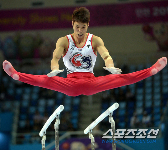 2014 인천아시안게임 기계체조 남자 개인 종합 결승전이 23일 인천 남동체육관에서 열렸다. 한국의 이상욱이 평행봉 연기를 하고 있다.