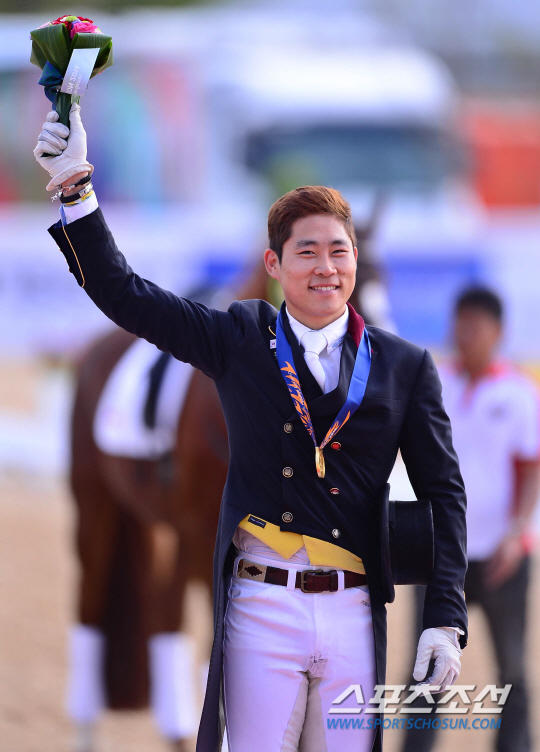 23일 오후 인천 드림파크 승마장에서 2014 인천 아시안게임 승마 마장마술 개인전이 열렸다. 마장마술에서 금메달을 딴 황영식이 기뻐하고 있다.