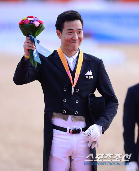 23일 오후 인천 드림파크 승마장에서 2014 인천 아시안게임 승마 마장마술 개인전이 열렸다. 마장마술에서 은메달을 차지한 김동선이 환하게 웃고 있다.