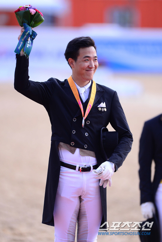 23일 오후 인천 드림파크 승마장에서 2014 인천 아시안게임 승마 마장마술 개인전이 열렸다. 마장마술에서 은메달을 차지한 김동선이 환하게 웃고 있다.
