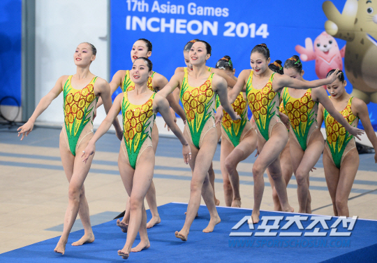 북한 싱크로나이즈드 스위밍대표팀이 23일 인천문학박태환수영장에서 열린 2014인천아시안게임 여자프리컴비네이션 결승전에 출전하고 있다.