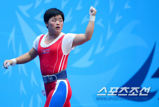 23일 인천 송도 달빛축제정원 역도경기장에서 '2014인천아시아경기대회' 역도 여자 63kg급 경기가 열렸다. 북한대표 조복향이 용상 1차시기를 성공시키고 있다. 주먹을 쥐어보이고 있는 조복향.