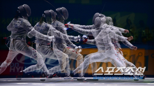 23일 오후 경기도 고양시 고양체유관에서 2014 인천 아시안게임 펜싱 여자 사브르 단체전이 열렸다. 한국 이라진(오른쪽)이 중국 퀴안을 상대로 공격을 시도하고 있다.