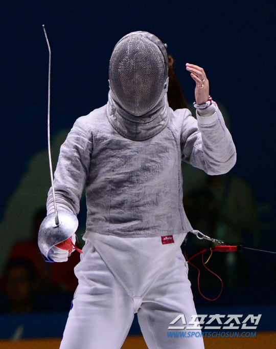 23일 오후 경기도 고양시 고양체유관에서 2014 인천 아시안게임 펜싱 여자 사브르 단체전이 열렸다. 한국 윤지수의 강력한 공격에 검 끝이 휘고 있다.