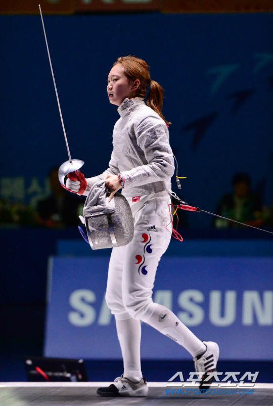 23일 오후 경기도 고양시 고양체유관에서 2014 인천 아시안게임 펜싱 여자 사브르 단체전이 열렸다. 한국 윤지수가 헬멧을 벗고 있다.