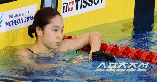한국수영대표팀 박한별이 23일 인천문학박태환 수영장에서 열린2014인천아시안게임 여자 50m 배영 결승전에서 역영하고 있다. 박한별은 3위와 0.05초 차이로 4위에 머물렀다.