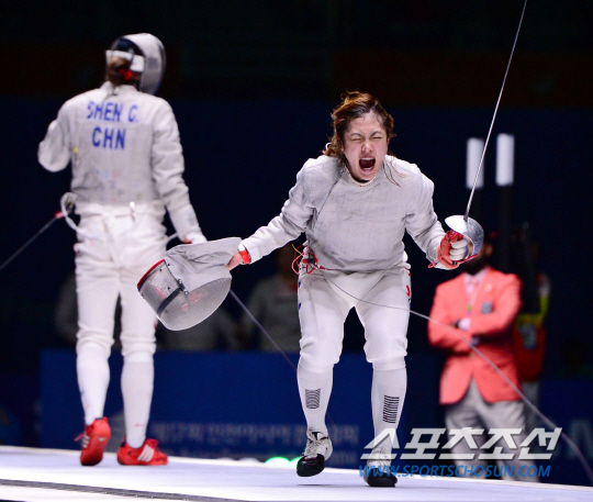 23일 오후 경기도 고양시 고양체유관에서 2014 인천 아시안게임 펜싱 여자 사브르 단체전이 열렸다. 한국의 마지막 주자인 김지연이 중국에 승리하며 금메달을 획득하자 환호하고 있다.